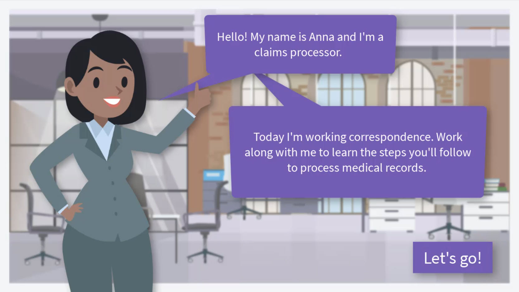 This scenario follows a fictional process as a claims adjuster reviews medical records. To create the clip, I obtained vector graphics from freepik.com and edited them using Adobe Illustrator. Camtasia’s interaction tools allowed me to create a simple branching scenario using buttons and markers on the timeline.